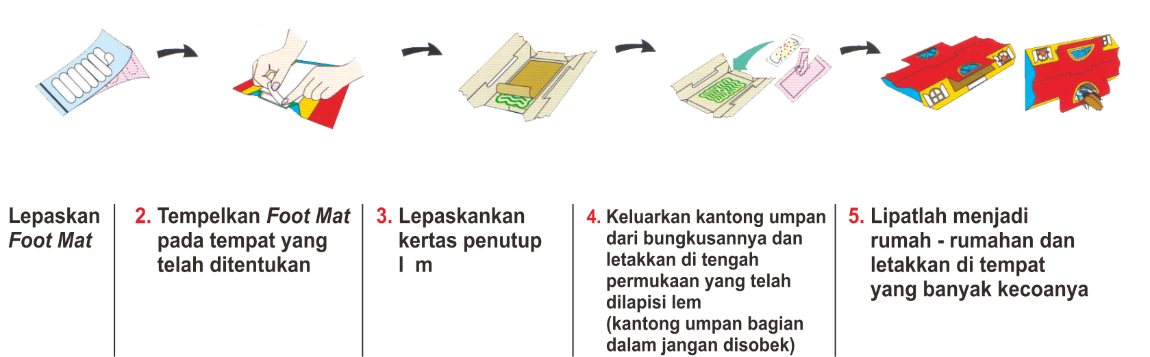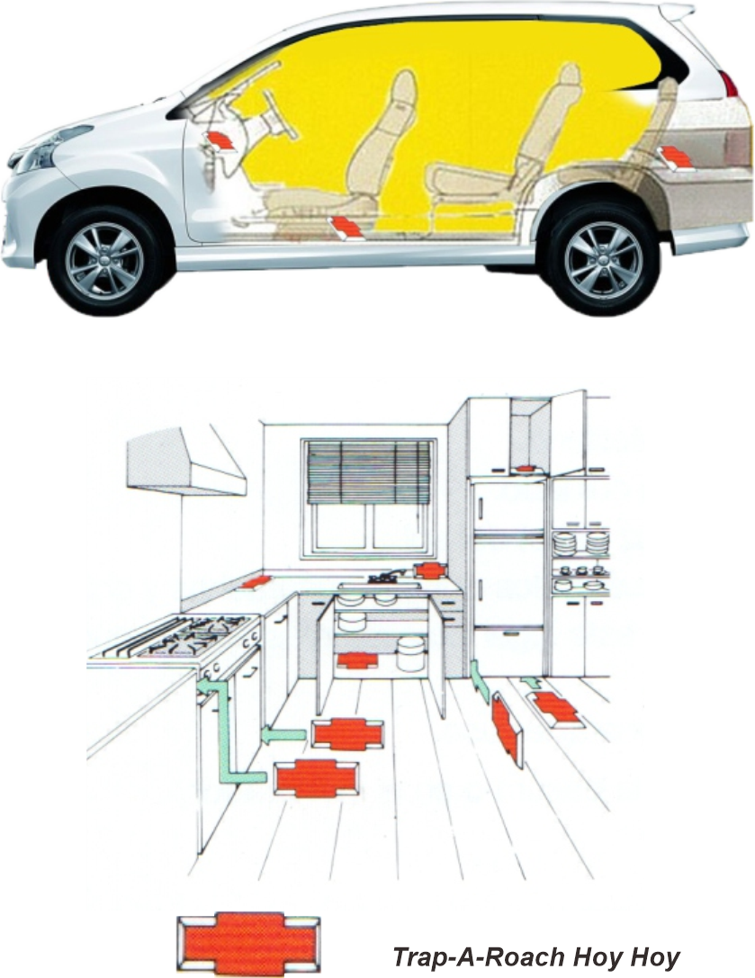 2. Untuk penggunaan dalam tempat tinggal/restaurant/Gudang, dll : Letakkan Hoy Hoy di tempat dimana kecoa sering terlihat misalnya dibawah zinc, dalam kitchen et, laci, bawah kulkas, sudut-sudut ruangan dll.